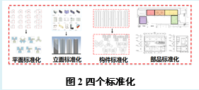 装配式建筑标准化设计原则为模数统一、模块协同、少规格、多组合,各专业一体化考虑,实现平面、立面、构件、部品部件标准化,进而实现生产工艺、施工工艺、周转材料标准化,提高施工效率,降低材料采购成本及施工成本。四个标准化如图2所示。