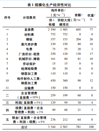 根据相关数据统计,装配式建筑项目达到一定规模后,成本会逐步降低,尤其可降低模具摊销费用等构件生产成本,并通过合理安排的部署减少人工成本投入。住建部科技与产业化发展中心对全国12个典型楼盘单栋楼与规模化应用装配式建筑的成本差异进行对比分析,发现规模化生产对降低生产成本的贡献较大,使构件单价降低780元/ m3 ,降幅约23%。规模化生产经济性对比如表1所示。